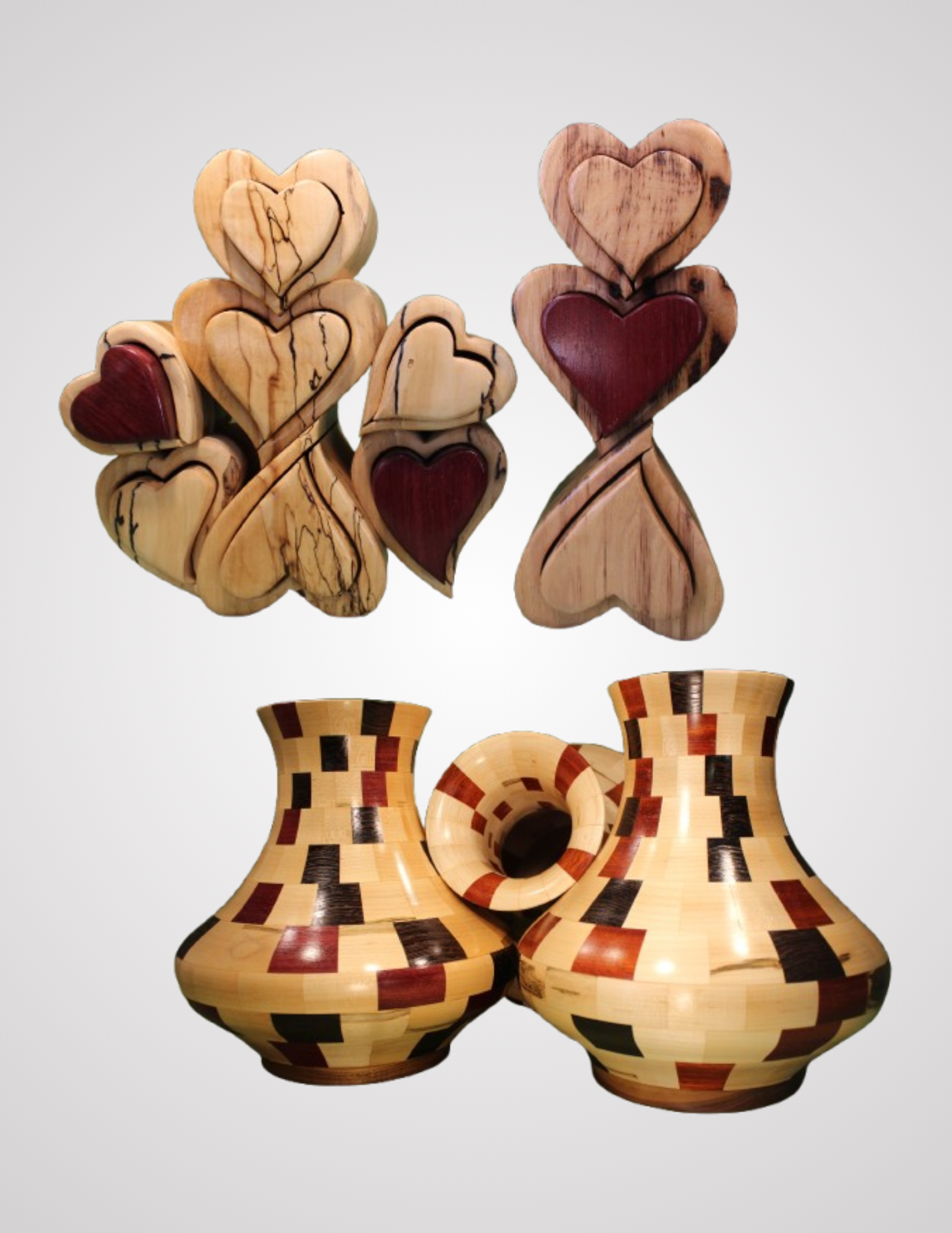 Wooden heart-shaped objects on a white background with 'Thom Pabst Creations' branding.