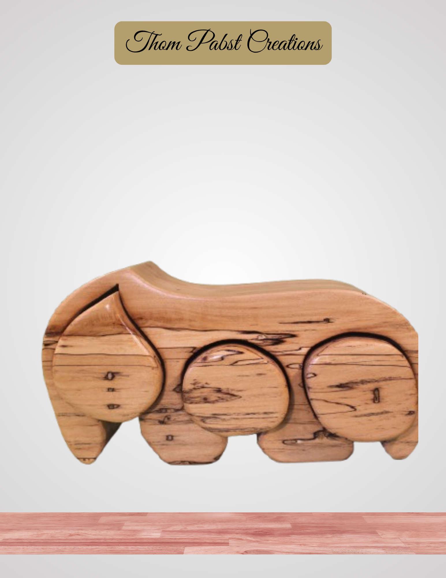 Wooden heart-shaped objects on a white background with 'Thom Pabst Creations' branding.